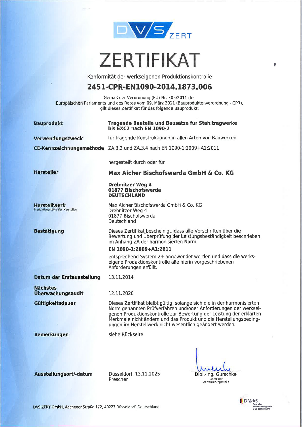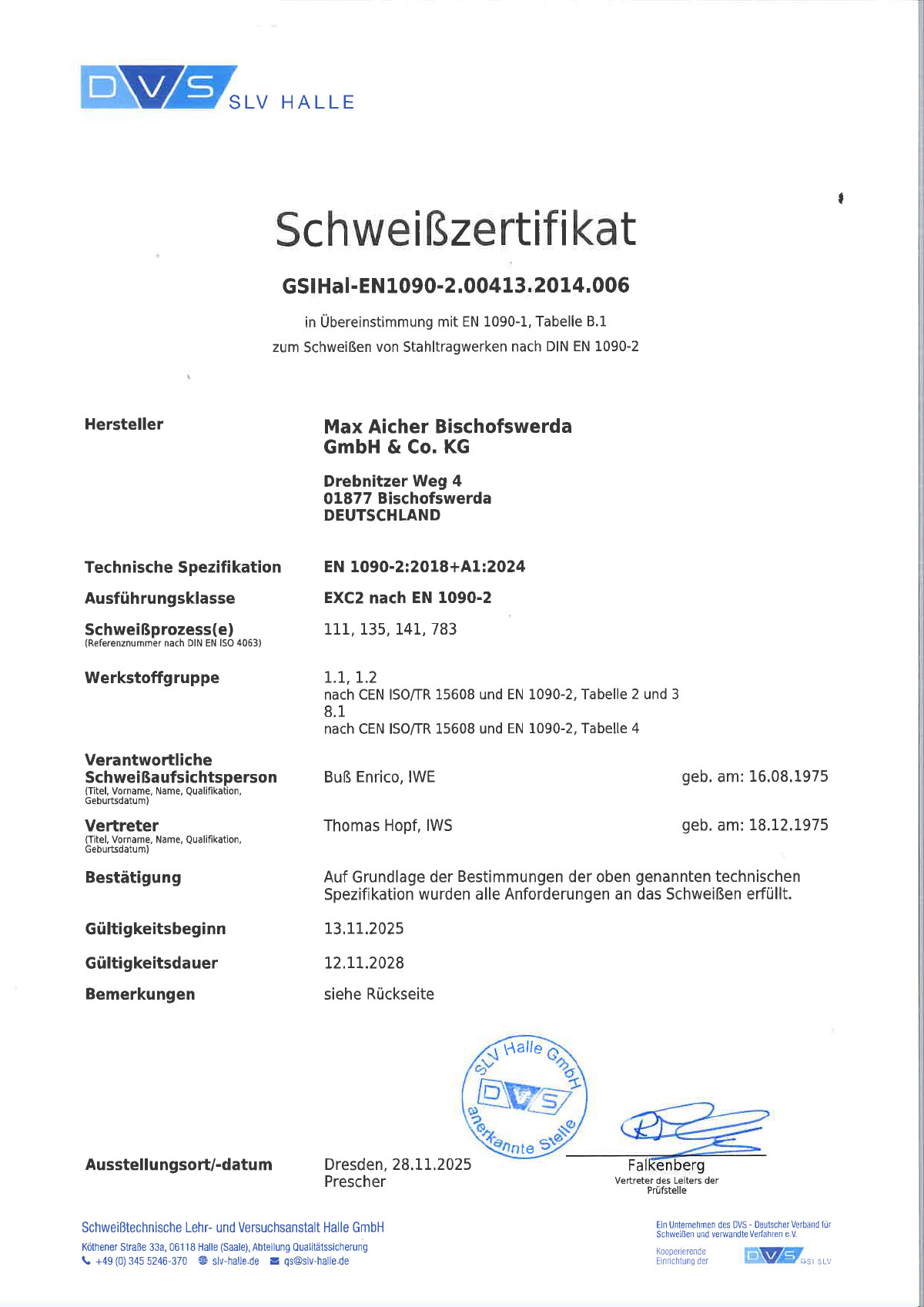 Wir sind ein anerkannter Schweißfachbetrieb und verfügen über die Herstellerqualifikation zum Schweißen nach EN1090-2 und DIN EN ISO 3834-2